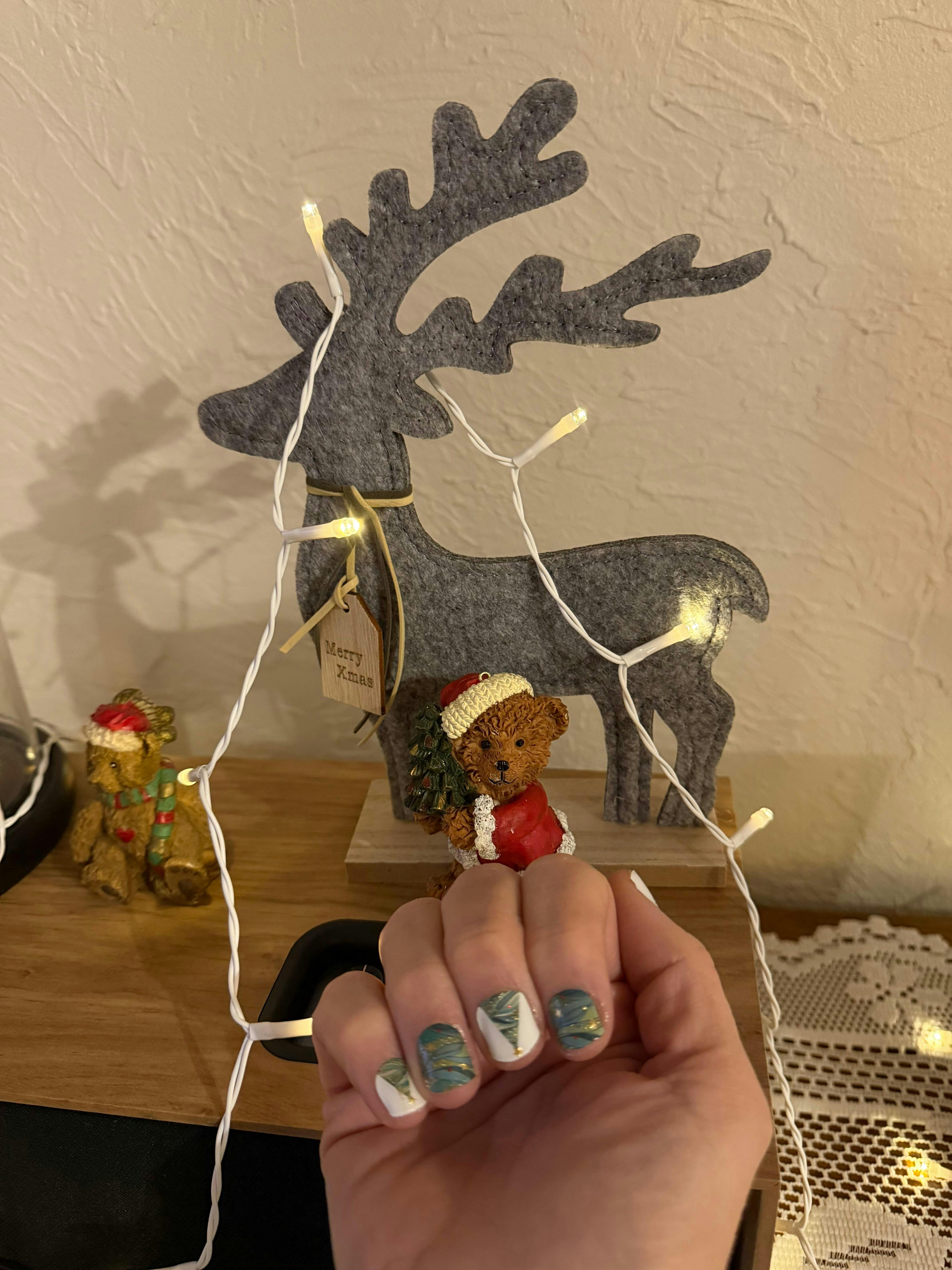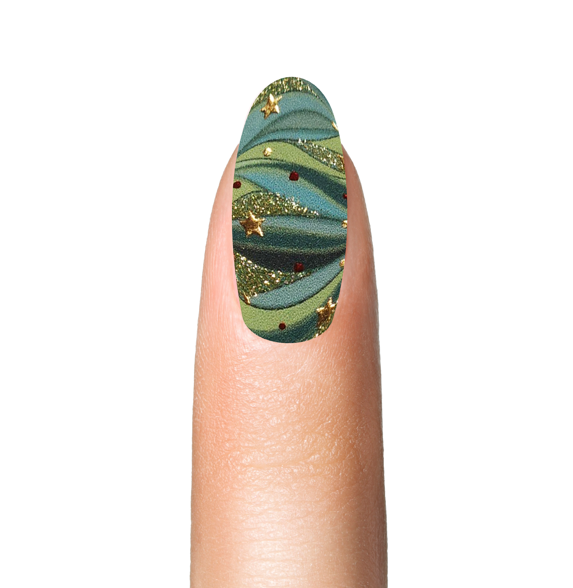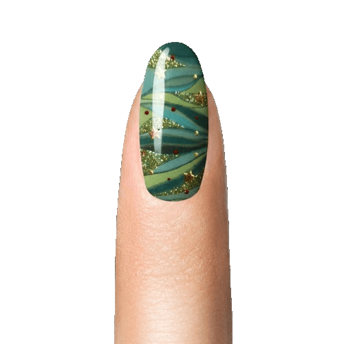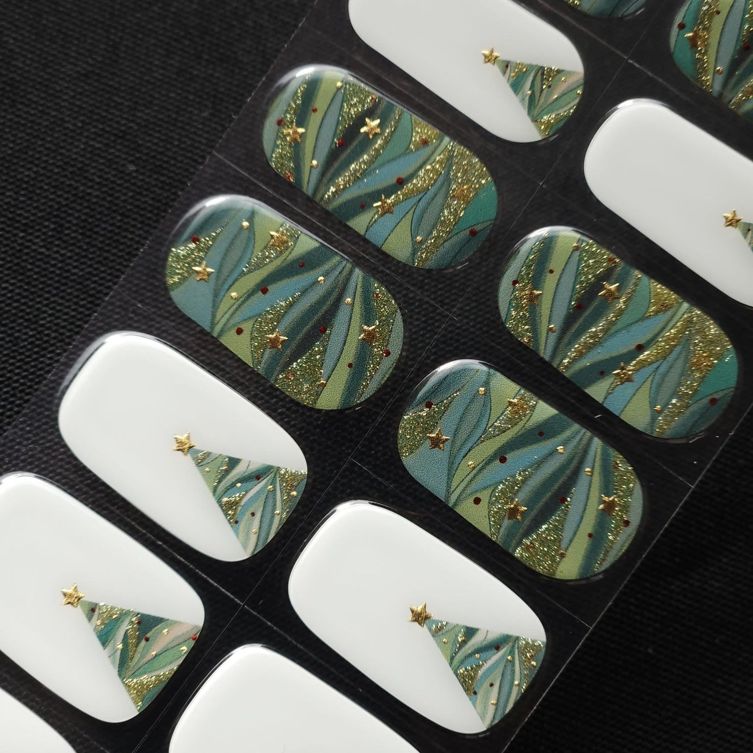 Adoptez un Nail Art de niveau supérieur avec notre référence Eva. Le design alterne entre une base blanc laqué et un motif abstrait inspiré des feuilles de pin ou des vagues d'Émeraude. Les touches de feuille d'or et de paillettes ajoutent une dimension luxueuse et scintillante. La présence de petits sapins minimalistes confère une touche hivernale sans être surchargée. Un ensemble tendance pour celles qui aiment l'art sur leurs ongles.