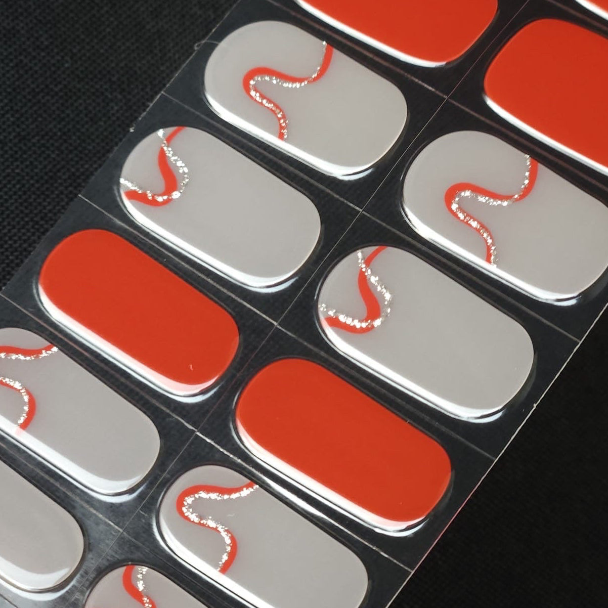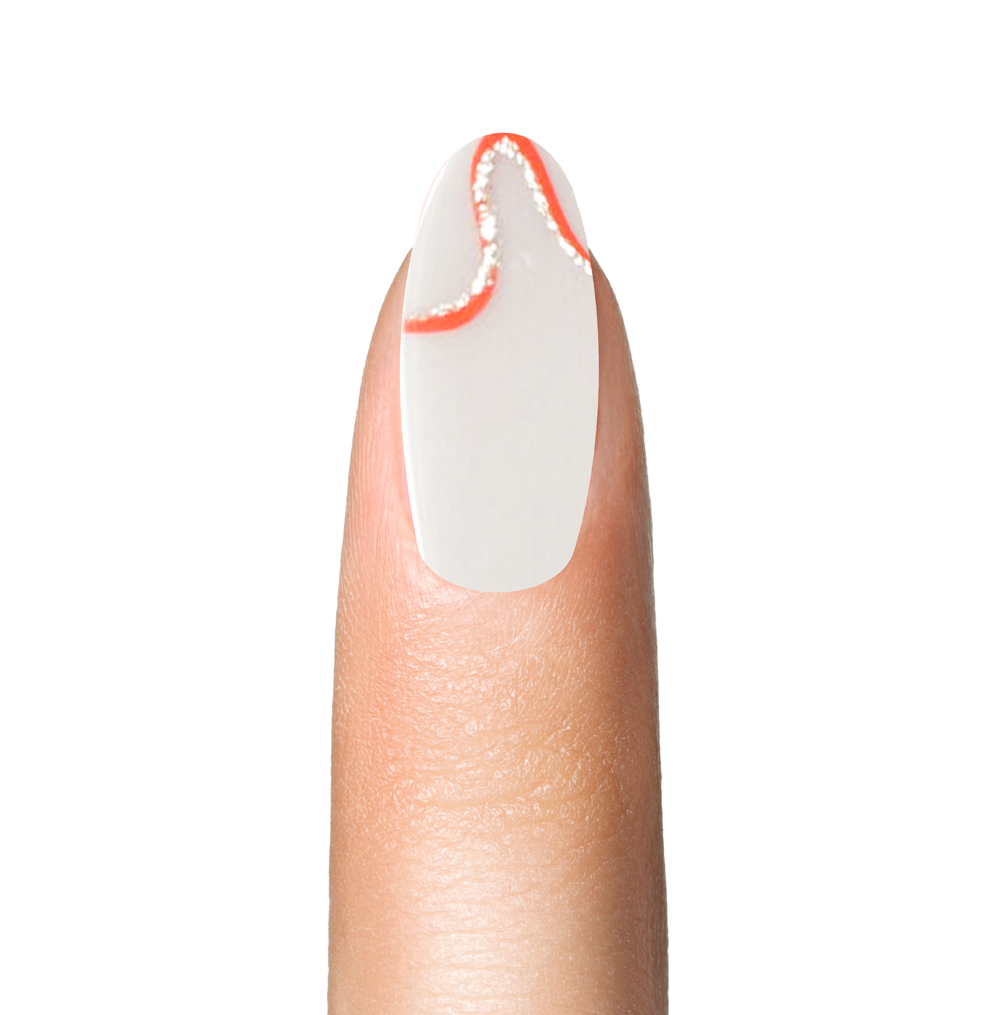Un design qui combine l'intensité d'une couleur vive avec un nail art graphique et moderne : une vague de couleur unie est soulignée par un trait argenté scintillant. Cet ensemble est conçu pour créer un effet de nail art professionnel et équilibré, en utilisant les bandes unies pour accentuer les ongles décorés. Une manucure qui exprime l'énergie et la précision du design.
